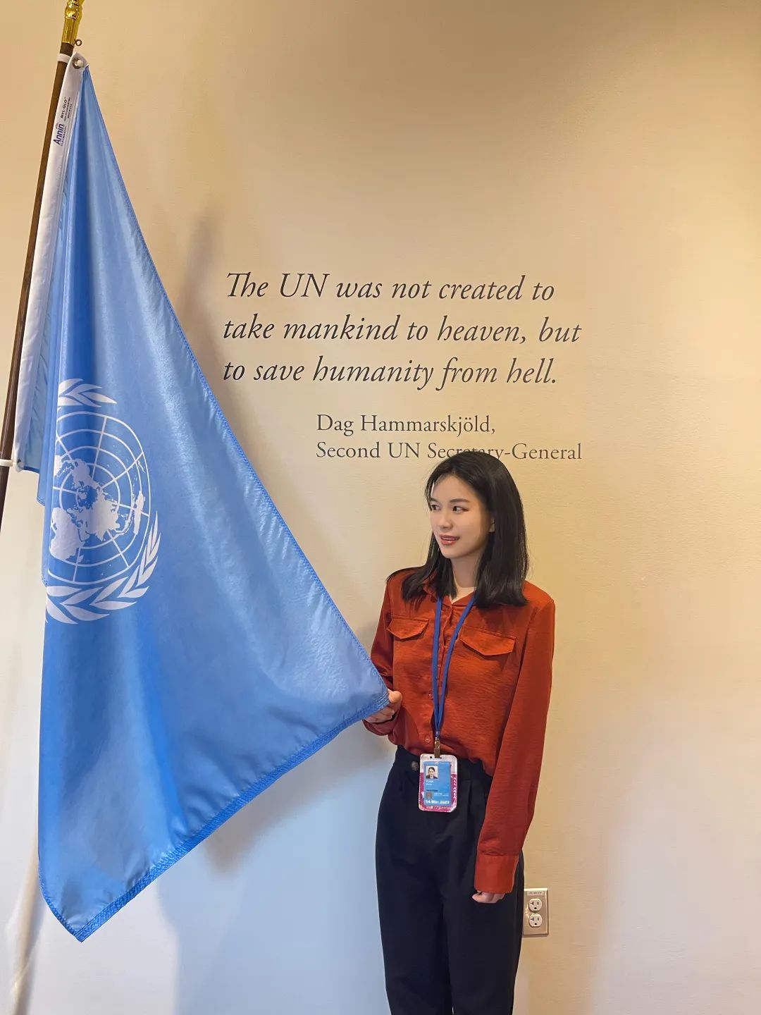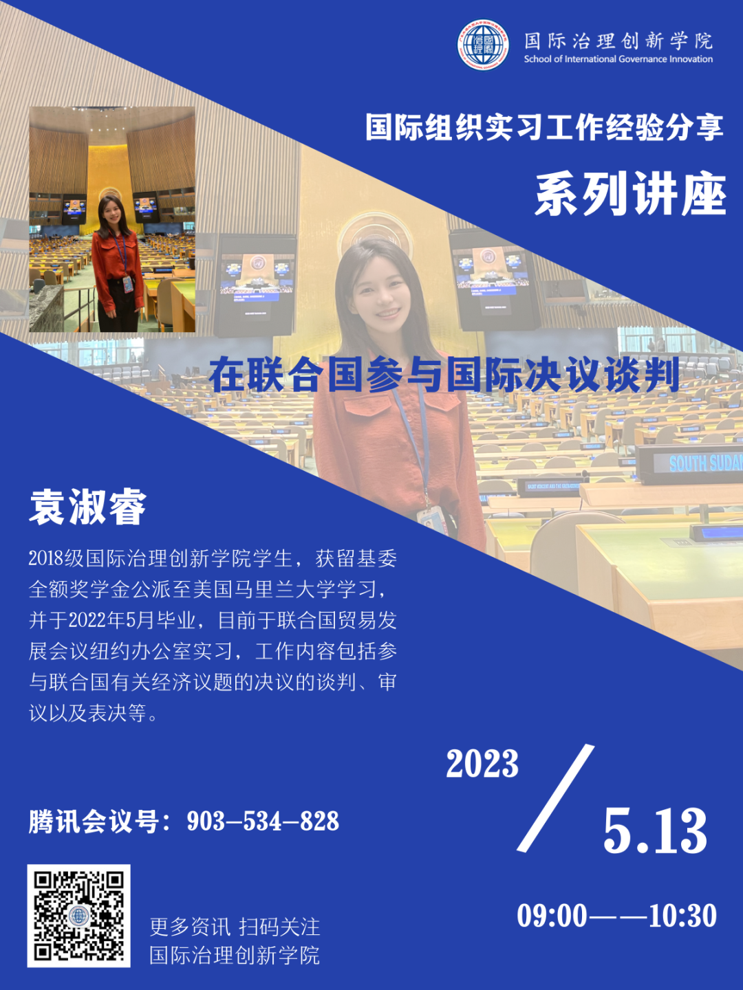 袁淑睿,2018级国际治理创新学院学生,获留基委全额奖学金公派至美国马里兰大学学习,并于2022年5月毕业,目前于联合国贸易发展会议纽约办公室实习,工作内容包括参与联合国有关经济议题的决议的谈判、审议和表决,参与联合国77届大会二委有关主题会议并撰写总结报告,协助组织社会和团结经济、社会科技和创新等主题活动,更新办公室的社交媒体账号等。