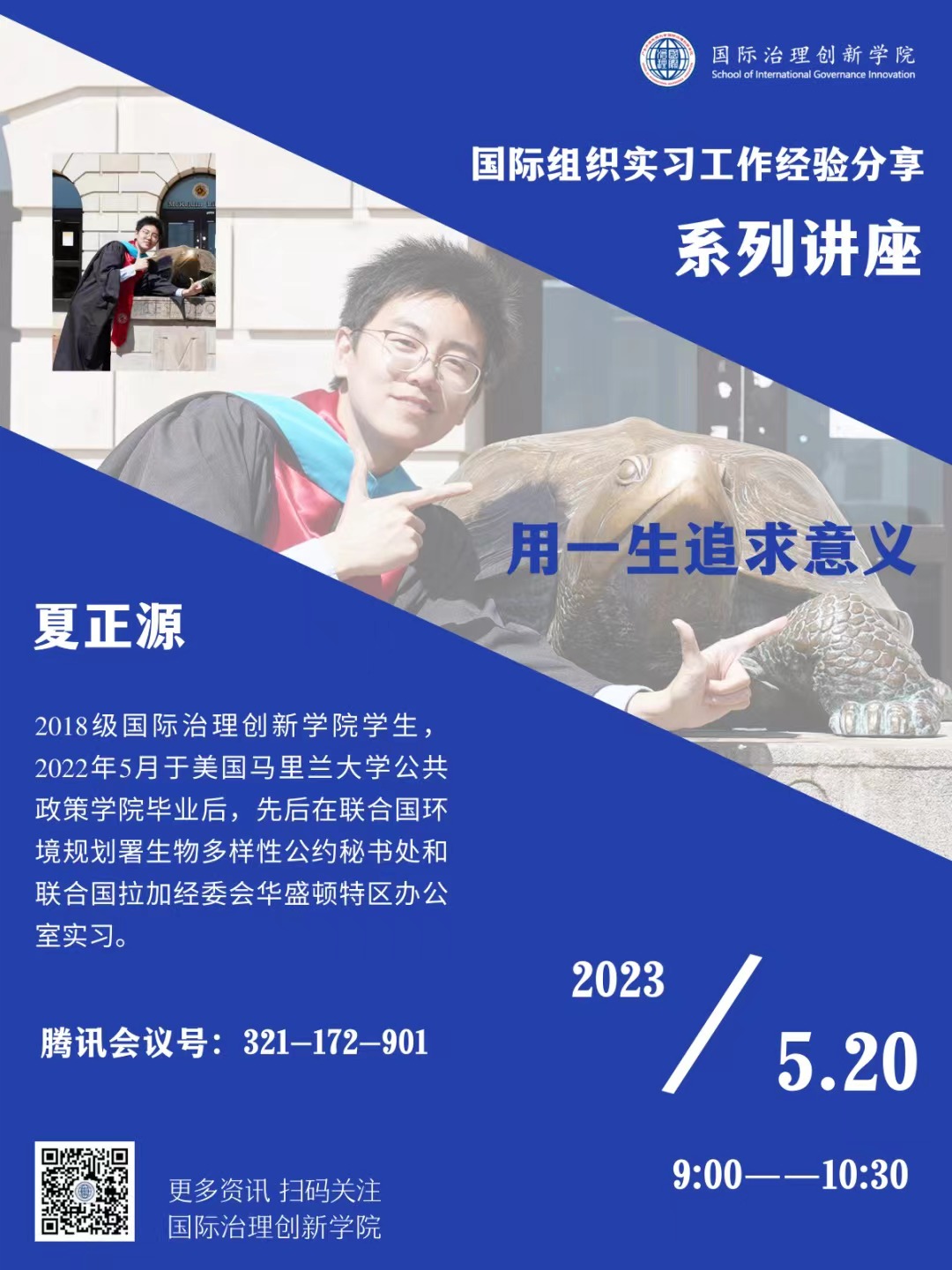2023年5月20日,国际治理创新学院将邀请2018级学子夏正源出席“国际组织实习工作经验分享系列讲座”。夏正源同学将介绍他在联合国环境规划署生物多样性公约秘书处和联合国拉加经委会华盛顿特区办公室的实习工作情况,他分享的题目是“用一生追求意义”,欢迎老师同学们参加。