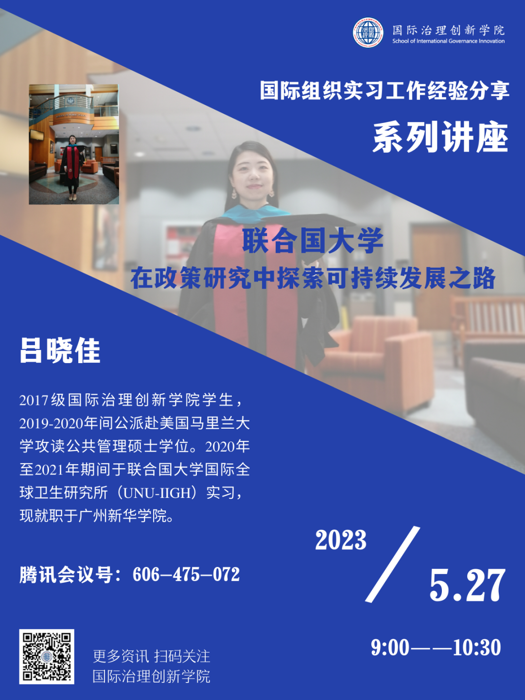 2023年5月27日,国际治理创新学院将邀请2017级学子吕晓佳出席“国际组织实习工作经验分享系列讲座”。吕晓佳同学将介绍她在联合国大学全球国际卫生研究院的实习工作情况,她分享的题目是“联合国大学——在政策研究中探索可持续发展之路”,欢迎老师同学们参加。