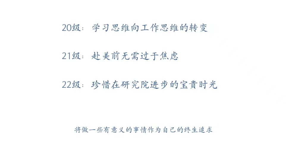 随后,夏正源分享了自己留学与工作生活的心得体会,并对不同年级的学生提出了宝贵的建议。对于2019级和2020级学生,他认为,大家在学校学好专业课知识的同时,还要提升自己的软实力与硬实力。所谓软实力,即团队合作能力、沟通交流能力、自我学习能力等。而硬实力是指能够熟练掌握各种数据软件,包括数据处理、项目管理、平面设计、视觉材料设计等。夏正源强调,2019级和2020级的同学们即将从马里兰大学毕业,不能将自己局限于学生思维,应提前适应职场生活。对于2021级学生,夏正源希望大家在赴美之前不用过于焦虑,放平心态迎接一切挑战,同时应当珍惜剩下的宝贵时光,时刻与学院保持密切联系,积极参与学院的集体活动,继续学习,提升自己。对于2022级学生,夏正源鼓励同学们将国际治理作为自己的终身追求,相信在国际治理创新学院的奋斗经历终将成为未来成功的基石。