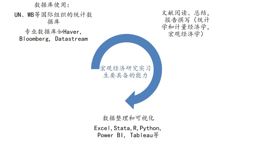 夏正源强调,宏观经济研究领域的实习生需要具备多方面的能力。首先,要能够熟练使用数据库,如联合国、世界银行等国际组织的统计数据库以及Haver、Bloomberg、Datastream专业数据库等。其次,要有文献总结、整理和汇报的能力,尤其是英文文献的撰写能力。其中,他特别强调统计学、计量经济学以及宏观经济学的基础十分重要,这能使文献工作更加得心应手。此外,还应熟练运用数据整理和可视化工具,如Excel、Python、Tableau、Stata等。夏正源还深切体会到语言技能的重要性,他表示,若有志于长期在联合国工作,除了英语之外,也有必要掌握法语和西班牙语。