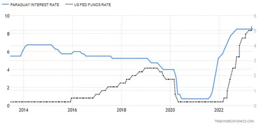 2012-2022年巴拉圭瓜拉尼利率与美元利率
