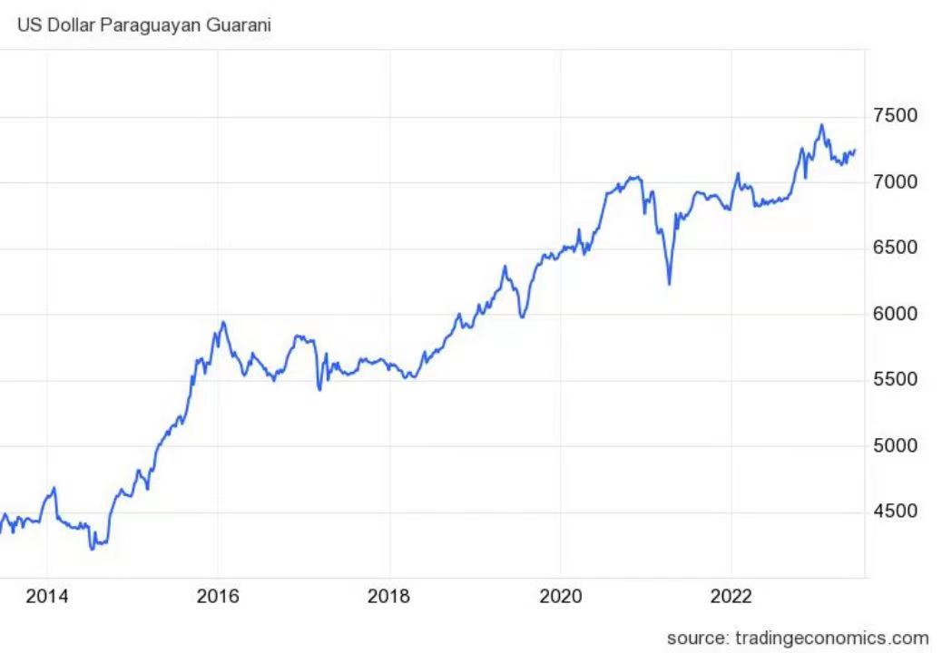 近十年巴拉圭瓜拉尼贬值幅度大,美元兑巴拉圭瓜拉尼总体走高,从4500左右升至7250,相对美元的贬值幅度为60%。2014年末至2016年初是美元兑巴拉圭瓜拉尼值的陡峭上升区间,2016年至2018年总体较为平稳,2018年至今贬值约四分之一。