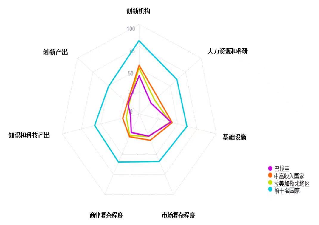 全球创新指数(Global Innovation Index,GII)根据创新能力对世界经济体进行排名,其由大约80个指标组成,分为创新投入和产出,旨在从多个维度对不同国家的创新水平进行科学评价。根据2022年的全球创新指数,巴拉圭在全球的排名为第84位,在拉美的18个经济体中排名为第12位,巴拉圭创新水平连续三年上升。
