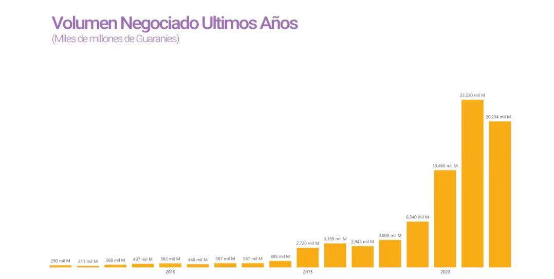 巴拉圭证券业并不发达。巴拉圭证券交易所2022年年度报告显示,其该年以美元计价的总交易量约为28亿美元,与中国万亿级及美国十万亿级的日成交量市场仍有相当大的差距。