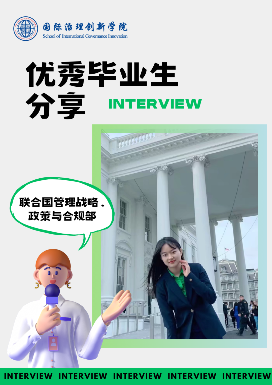 关于申请国际组织实习,黄梦玲表示她主要是通过Inspira网站进行实习申请,同时结合以往师兄师姐的经验,针对不同的岗位性质撰写不同的动机信(motivation letter),时刻关注新增的岗位,积极投递。从马里兰大学毕业后,她成功申请到了联合国管理战略、政策与合规部业务转型和责任部门 (Business Transformation and Responsible Department,BTRD) 分析和项目管理团队的实习岗位,主要负责支持项目和计划的开发和实施,协助团队与客户沟通,提供信息和培训材料指导等。在结束此次实习后,黄梦玲计划继续申请联合国环境规划署(United Nations Environment Programme,UNEP)的实习,因为她深切关心环境,特别是气候变化和可持续发展等问题。联合国环境规划署通过提供政策建议、开展项目和国际协作来解决当今世界面临的许多重要的环境问题,在全球环保和可持续性方面扮演着关键角色。她希望有机会能与该领域的专业人士共同努力,为地球环境创造更美好的未来。