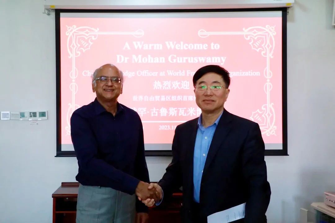 2023年11月25日上午,世界自由贸易区组织(World Free Zones Organization, World FZO)首席知识官、剑桥大学贾吉商学院(Cambridge University Judge Business School)研究员莫汉·古鲁斯瓦米博士(Mohan Guruswamy)来访广东外语外贸大学国际治理创新学院,就与我院专家合作开发国际战略学课程事宜座谈交流,并介绍了世界自由贸易区组织有关情况,国际治理创新学院的部分师生参加了座谈交流会,赵龙跃教授主持。