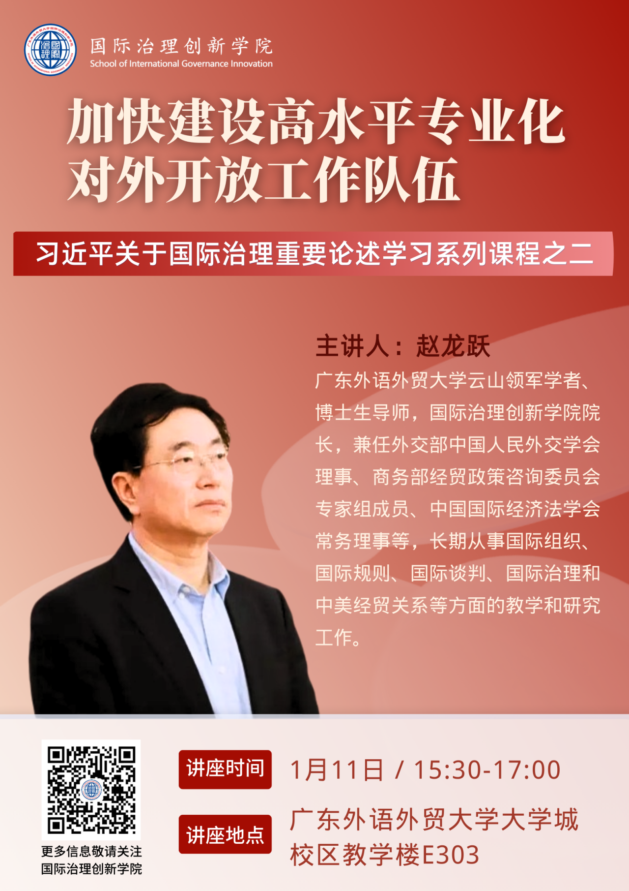赵龙跃教授,现为广东外语外贸大学云山领军学者、博士生导师,国际治理创新学院院长,兼任外交部中国人民外交学会理事、商务部经贸政策咨询委员会专家组成员、中国国际经济法学会常务理事等。