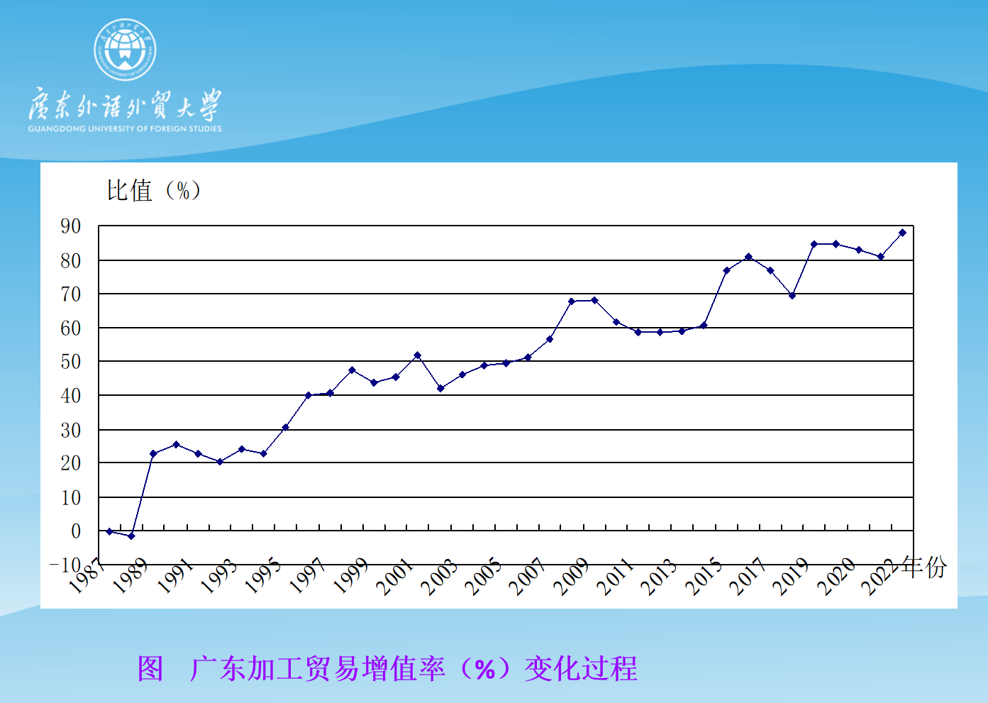 在对全球价值链和加工贸易有了充分的梳理之后,陈万灵教授聚焦于广东加工贸易,运用真实精确的数据与清晰易懂的图表,阐释了加工贸易在不同时期的增长与地位变化。他强调,在90年代后期,政策作用开始由先前的鼓励转变为中性。进入了21世纪之后,中国加入WTO,外贸出现“超常规”增长,而加工贸易在保持高速增长的同时也显现出了疲态,地位开始下降,针对加工贸易的限制性措施也随之增多,国际金融危机叠加,转型升级迫在眉睫。对此,陈万灵教授基于国际国内经贸环境,就加工贸易发展的问题及其转型升级必然性进行了一定的阐述。