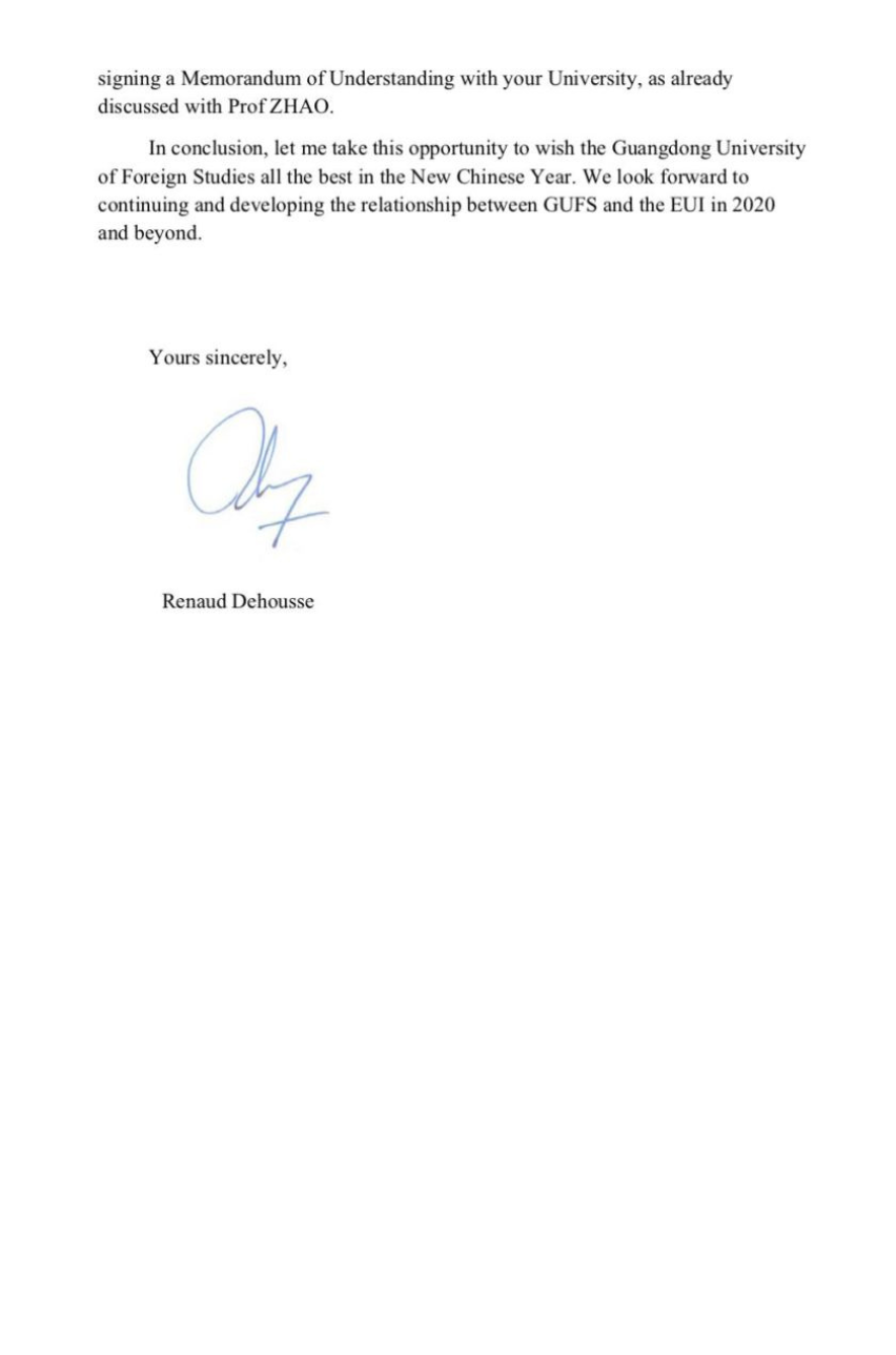 在2020年我国全力抗击疫情之际,欧洲大学学院雷诺·德乌斯校长专门发来慰问信,对我国应对疫情的果断举措表示高度赞赏。斯图布院长通过视频会议,共同商讨在疫情条件下选拔优秀中国学生参与EUI跨国治理硕士研究生项目的办法,进一步深化与国际治理创新学院的全面合作关系。在双方的共同努力下,两校成功在2020年正式开启国际治理创新人才项目,国际治理创新学院每年选拔推荐5-10名学生前往EUI跨国治理学院攻读跨国治理硕士学位,具体的招生和合作方案请见微信推送。