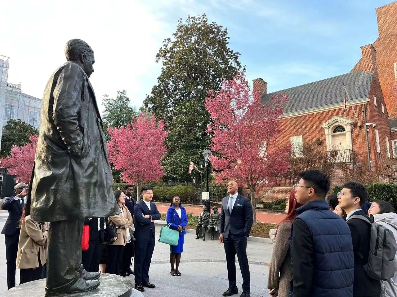 美国东部时间3月13日,国际治理创新学院2021级学生在马里兰大学公共政策学院(School of Public Policy, SPP)Clyde Moore先生(退役上校)的陪同下,前往马里兰州首府安纳波利斯(Annapolis)参观马里兰州议会大厦。马里兰州韦斯·摩尔(Wes Moore)州长会见了我院2021级留美学子,并对同学们的到来表示热烈的欢迎,希望同学们能借此活动了解美国州一级政府和议会的角色和职能,实地感受立法机关的工作环境和内容。