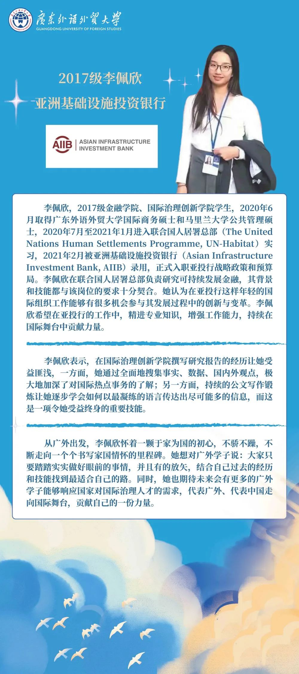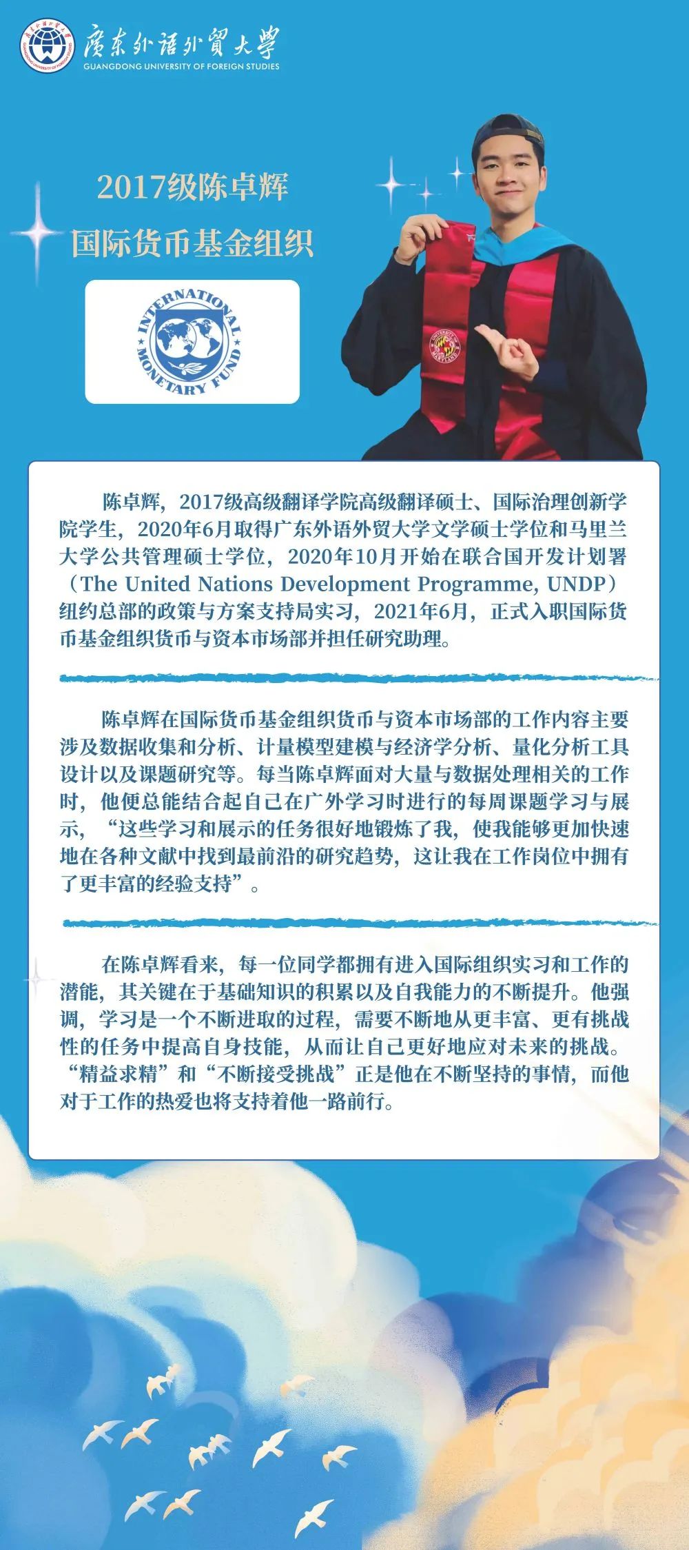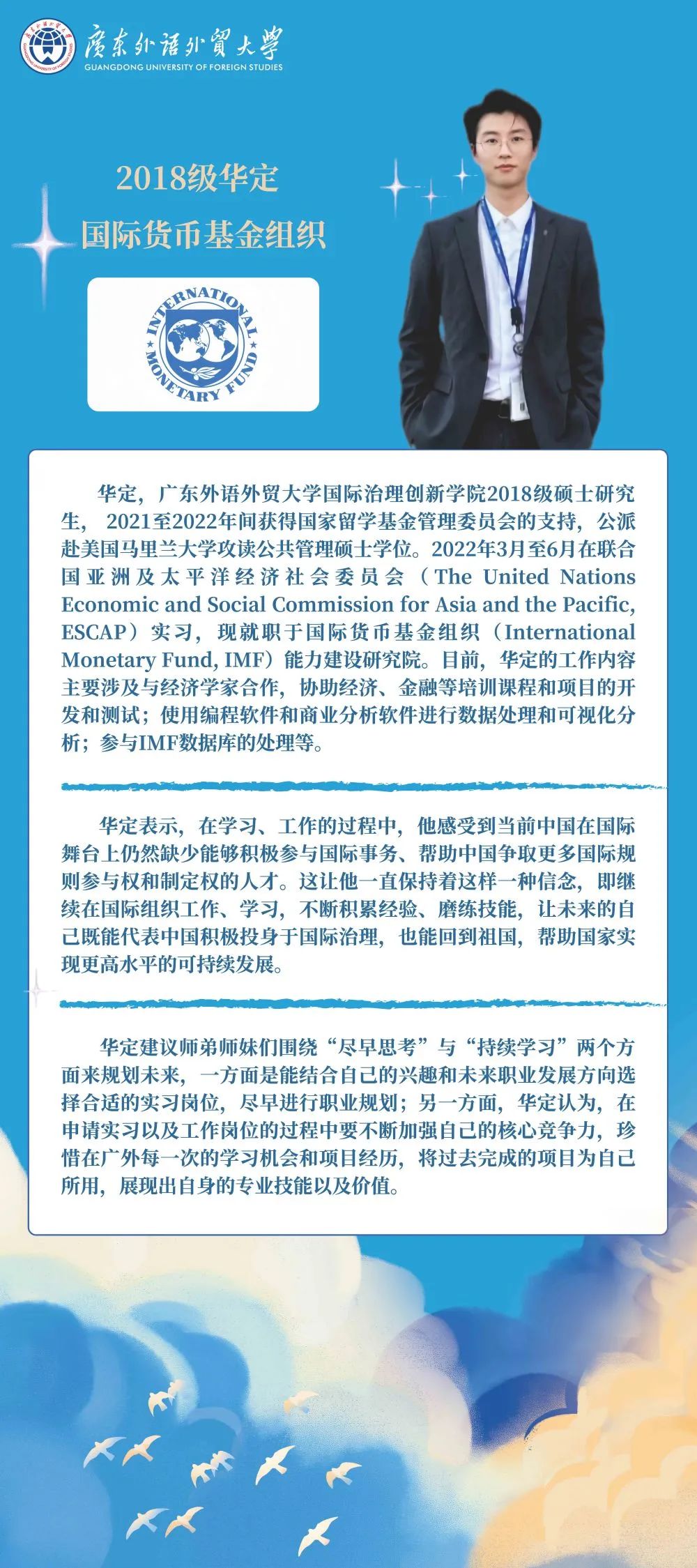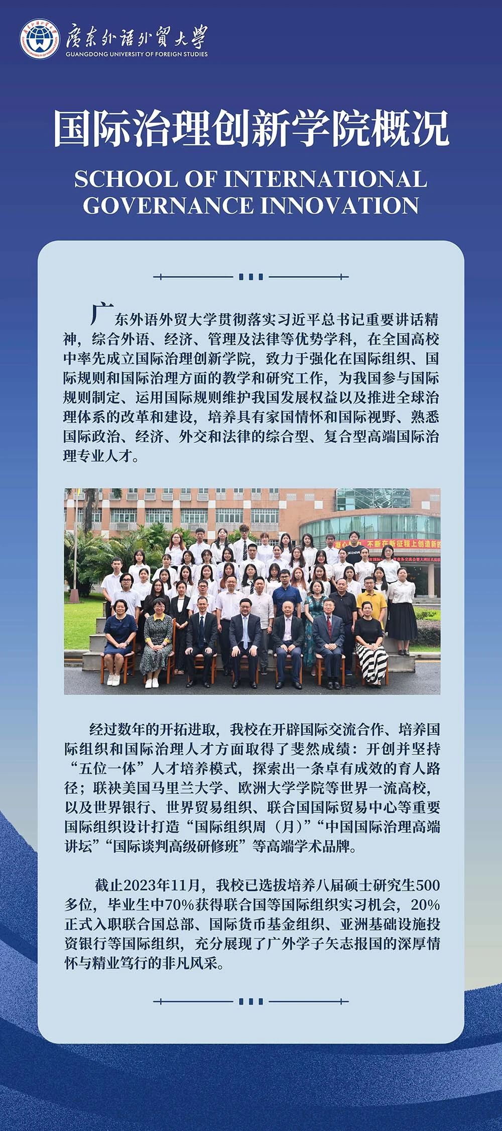 “国际组织和国际治理人才风采展览”分为国际治理创新学院概况、国际组织周(月)系列活动、中国国际治理高端讲坛和国际组织人才展四个版块。广外坚持创新具有广外特色的国际化人才培养体系,在培养综合型复合型高端国际治理人才方面取得了一系列新的突破。2016年至今,国际治理创新学院已选拔培养八届研究生500多位,三分之一的学生获得到美国马里兰大学继续学习的机会,在毕业的学生中有70%获得在联合国系统等国际组织实习工作的机会,包括联合国纽约总部、日内瓦和维也纳办公室,联合国开发计划署、人居署、贸易发展会议组织、国际贸易中心,亚太经社理事会等,实习机构遍及世界各地;20%正式入职国际组织,如联合国总部、国际货币基金组织和亚洲基础设施投资银行等。