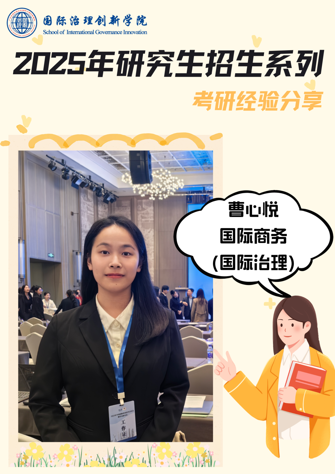 我是国际治理创新学院2023级的统考生曹心悦,很荣幸可以和大家分享我的考研经验与心得体会。我报考的是国际商务(国际治理)专业。考试科目包括政治、英语二、396经济类联考和434国际商务专业基础。具体的招生信息请同学们以《广东外语外贸大学2025年硕士研究生招生简章》(网址:https://yz.gdufs.edu.cn/info/1019/2487.htm)与《广东外语外贸大学2025年硕士研究生招生目录》(网址:https://yz.gdufs.edu.cn/info/1020/2485.htm)为准。