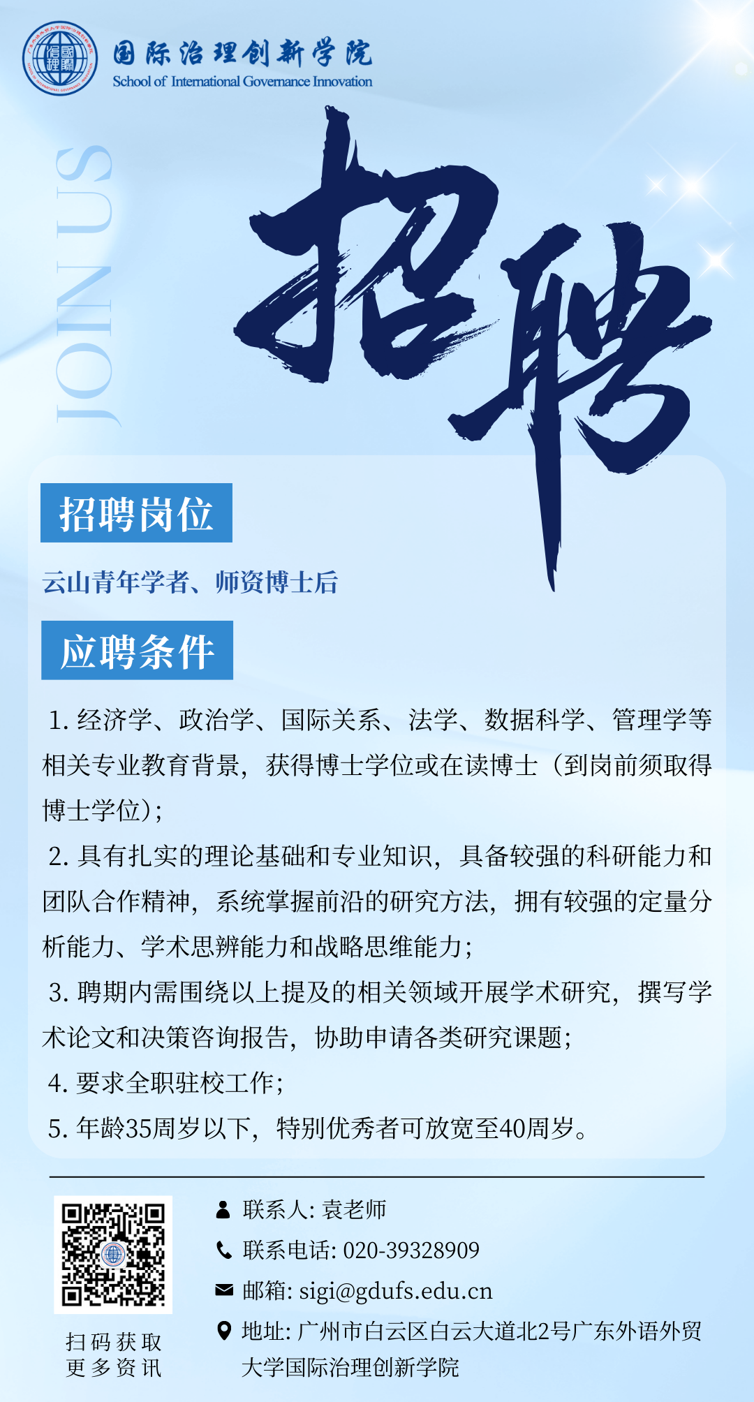有意应聘者请将简历和代表性论文论著发送至广东外语外贸大学国际治理创新学院邮箱<sigi@gdufs.edu.cn>。