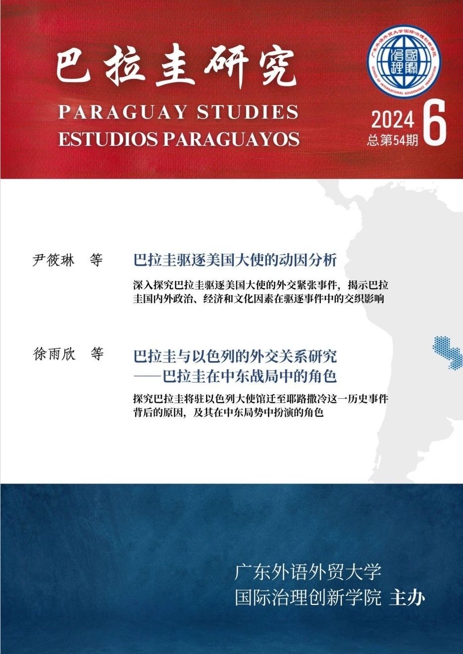 2024年起,我院期刊《巴拉圭研究参考》正式更名为《巴拉圭研究》,开始转型升级为专注巴拉圭国别学术研究的双月刊出版物,目前已经编辑发行54期。本刊不仅是我国决策界、学术界以及广大公众深入了解巴拉圭的宝贵窗口,也是我院充分发挥跨学科禀赋优势、顺应时代发展新要求、引领我国巴拉圭国别研究学科新发展的重要之举。10月,我院承办2024年“数字贸易促进可持续发展会议”等高质量学术论坛,与发展中国家共享跨国界知识平台。