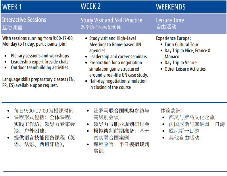 青年领导力训练营是国际劳工组织培训中心联合广东外语外贸大学国际治理创新学院共同规划与实施的青年领导力培训项目,为有志投身多边合作领域的青年提供所需的关键技能和知识。为期两周的课程在ITCILO举行以及罗马游学考察,将由国际专家团队亲授,帮助学员锻炼在国际舞台上持续发挥积极影响的核心能力。