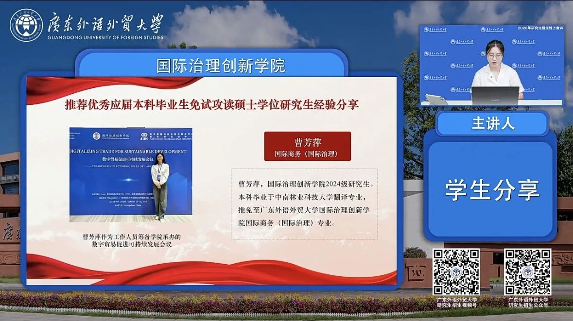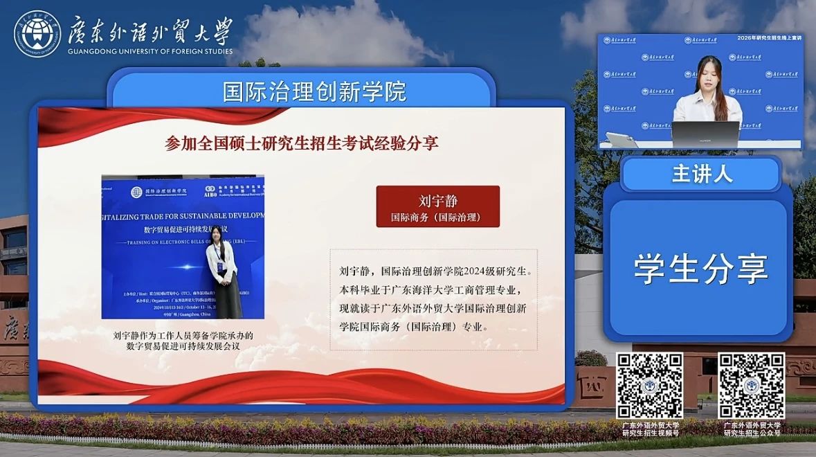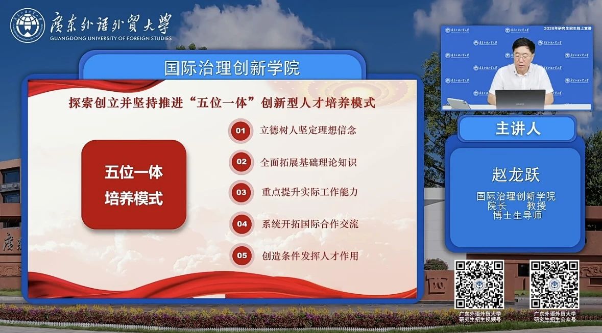 2025年6月27日,广东外语外贸大学国际治理创新学院2026年研究生招生线上宣讲会顺利举行。广东外语外贸大学云山领军学者、国际治理创新学院院长赵龙跃教授,国际治理创新学院2024级学生代表曹芳萍、刘宇静出席宣讲会,为全国准备报考研究生的同学们介绍相关情况并答疑解惑。本次宣讲会反响热烈,点赞量超过3.1万次,充分展现了广大学子对投身国际组织与国际治理事业、加入国际治理创新学院学习的浓厚兴趣与热情。