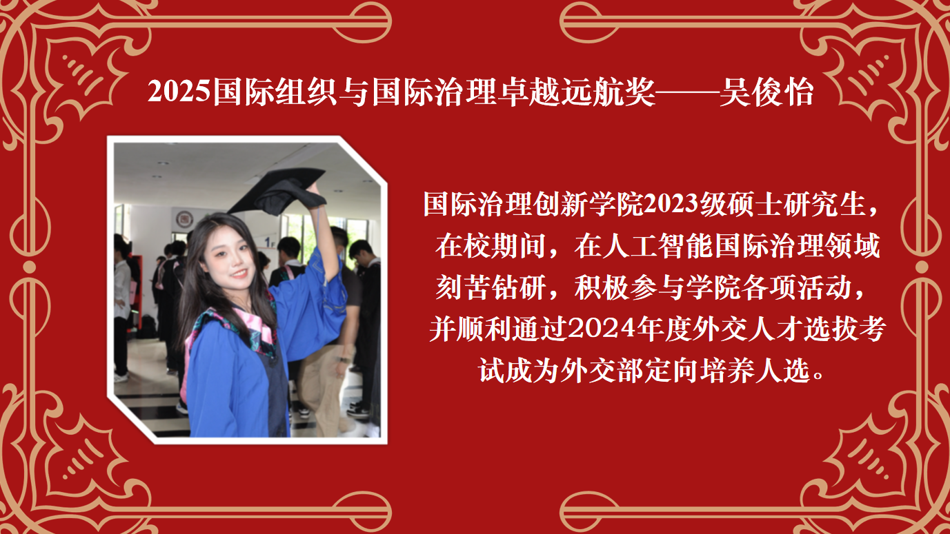作为获奖代表,吴俊怡表示,学院始终秉持“研究真问题、真研究问题”的育人理念,这让她在钻研中筑牢理想信念根基,她将始终以国家利益为重、以人民福祉为念、以人类前途为怀,把家国情怀融入国际治理实践。