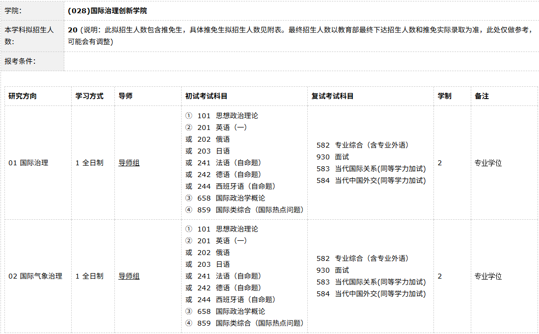 国际治理创新学院设置的国际事务专业下设国际治理与国际气象治理两大研究方向,设定两年学制。