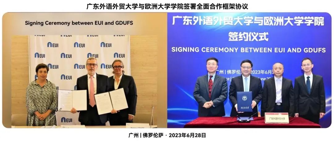On June 28, 2023, GDUFS and EUI signed the Agreement on Comprehensive Cooperation Framework between GDUFS and EUI, marking a new phase in the cooperation between the two parties.