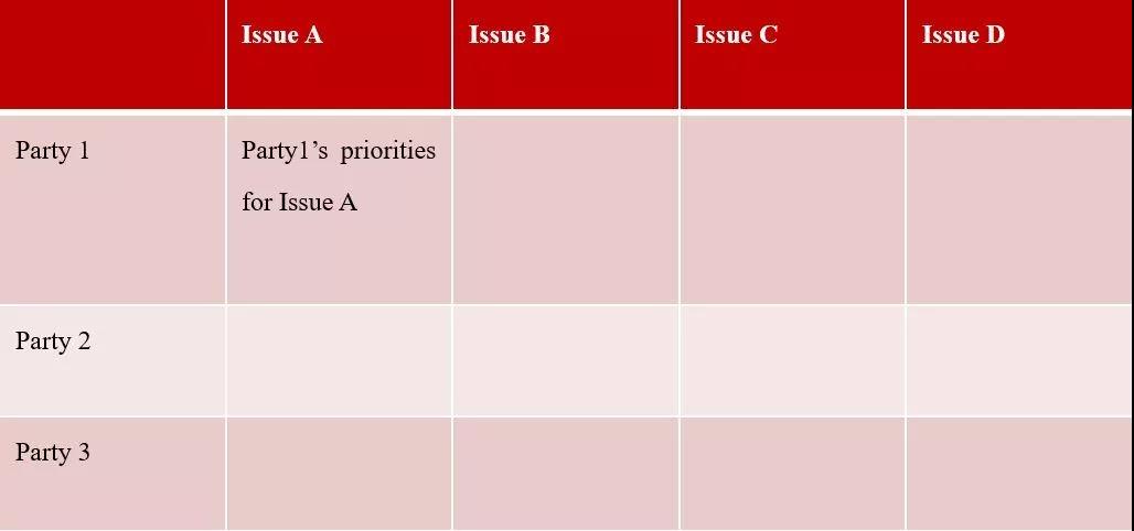 该表的纵轴表示各谈判方,横轴表示各谈判方的谈判诉求,按优先级排序。支付矩阵交叉表主要用于查看各谈判方的优先诉求以及达到谈判的协议区间。