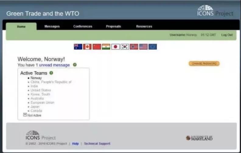 完成准备工作后, ICONS模拟谈判的下一步就是线上谈判。德文·埃利斯(Devin Ellis)教授作为Simcon(“Simulation Control”的简称),在马里兰大学模拟谈判中心系统(ICONS项目网站www.icons.umd.edu)发送了国际模拟谈判正式开始的message。各小组同时登录ICONSnet进行在线模拟谈判。