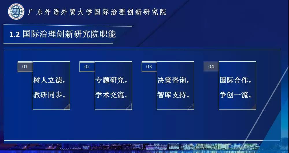 2016年12月,为贯彻党中央战略部署,落实习近平总书记中国引领全球治理体制改革新理念的指示精神,在教育部、国家留学基金委的大力支持下,我校综合外语和经管法的学科优势,成立国际治理创新研究院(School of International Governance Innovation,以下简称“研究院”),开启了对国际治理相关领域和综合复合型国际治理专业人才培养的系统研究和探索。