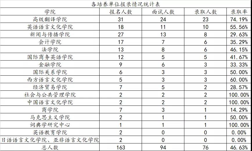 2019年招生工作中,我院最终录取76人(名单见附件)。南北校区人数占总人数比例分别为42.11%和57.89%,各培养单位报录情况参见下表。