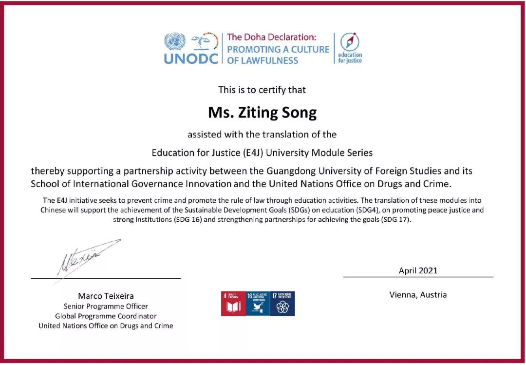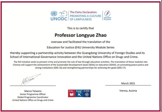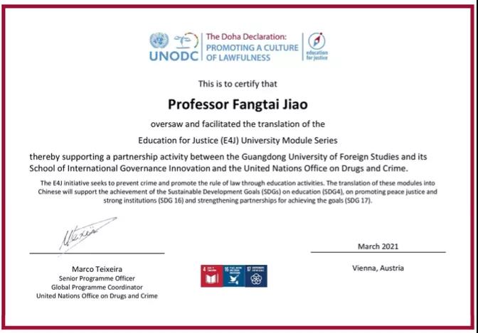 广东外语外贸大学副校长焦方太教授出席发布会并致辞,受到联合国专家的高度赞赏。联合国毒品和犯罪问题办公室(执行主任由联合国副秘书长兼任)对于我校领导给予E4J大学教程系列翻译工作的重视和支持表示衷心感谢,特别给予支持、指导这项工作的各位领导专家和参与翻译工作的同学们颁发了证书。