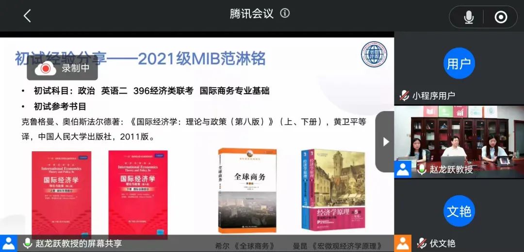 国际治理创新研究院2021级学生陶嘉懿、范淋铭和胡紫玉分别针对推免注意事项、统考初试复习经验以及研究院学习生活等内容作了简要介绍。