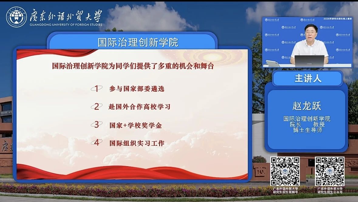 2025年6月27日,广东外语外贸大学国际治理创新学院2026年研究生招生线上宣讲会顺利举行。广东外语外贸大学云山领军学者、国际治理创新学院院长赵龙跃教授,国际治理创新学院2024级学生代表曹芳萍、刘宇静出席宣讲会,为全国准备报考研究生的同学们介绍相关情况并答疑解惑。本次宣讲会反响热烈,点赞量超过3.1万次,充分展现了广大学子对投身国际组织与国际治理事业、加入国际治理创新学院学习的浓厚兴趣与热情。