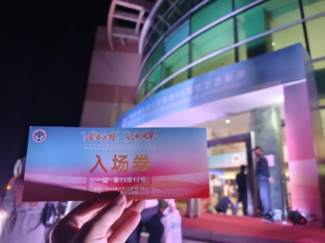 2025级吴雨珊:校庆那天,我在云山会堂观看了建校60周年文艺汇演。俄罗斯女主持优雅登场,歌舞节目横贯古今、融通中外,尽显广外特色。灯光交织,音乐激昂,同学们全情投入,现场气氛热烈。我被深深感染,决心不负青春,砥砺前行。