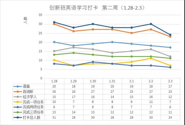 及时的总结和回顾是一项活动成功的保证,因此每日的班级学习情况汇总由李文丽同学负责,包括了每日汇报和每周总结。通过数据化和图表化的呈现,清晰地展现出同学们的学习状况,在激励大家坚持下“日日功”的同时,也营造出“你追我赶”的学习氛围。