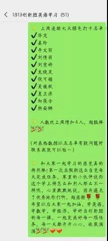 创新班的英语委员陈卓同学每日在微信群内公布当天的学习任务,发送相关的学习资料,来开启一天的英语学习!