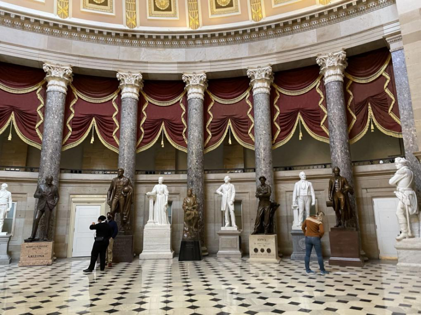 皮特曼局长带领同学们从国会大厦南侧众议院进入,映入眼帘的是长廊两侧各州杰出名人的雕像以及众议院各委员会办公室,门楣与墙壁上装饰着历史壁画及标语,时刻提醒着后人勿忘自由与民主的力量。
