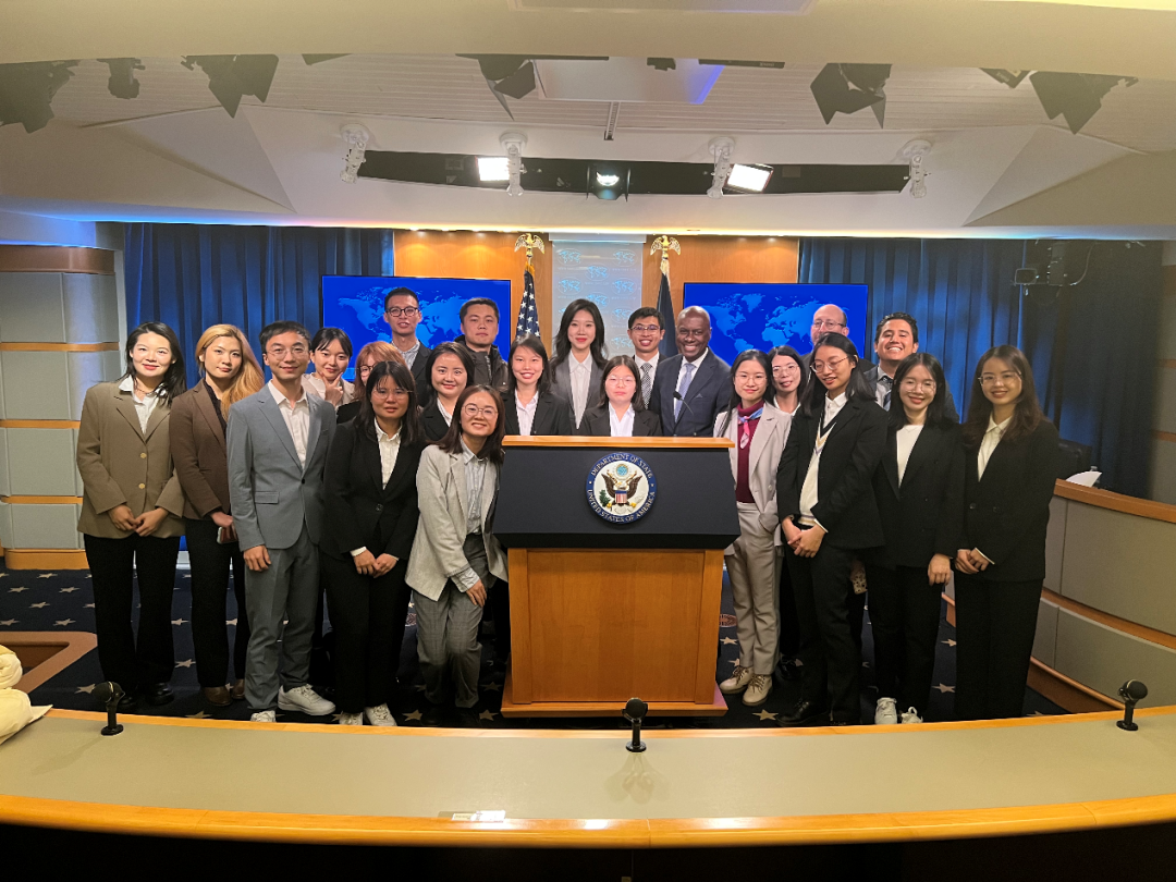 美国东部时间2022年12月6日上午十点,国际治理创新研究院2019、2020级在美留学生在马里兰大学公共政策学院(School of Public Policy,SPP)老师的带领下前往华盛顿美国国务院(United States Department of State)参观。作为公共政策学院为研究院学子特别筹划的一次游览教学活动,由公共管理专业的Michael Goodhart老师、Michael Horlick老师以及Clyde Moore上校(退役)亲自带队。虽然当天气温较低,早晨集合时还下了小雨,但同学们因获得宝贵参观学习机会的兴奋心情并没有受到天气的影响,出行大巴中一片欢声笑语。