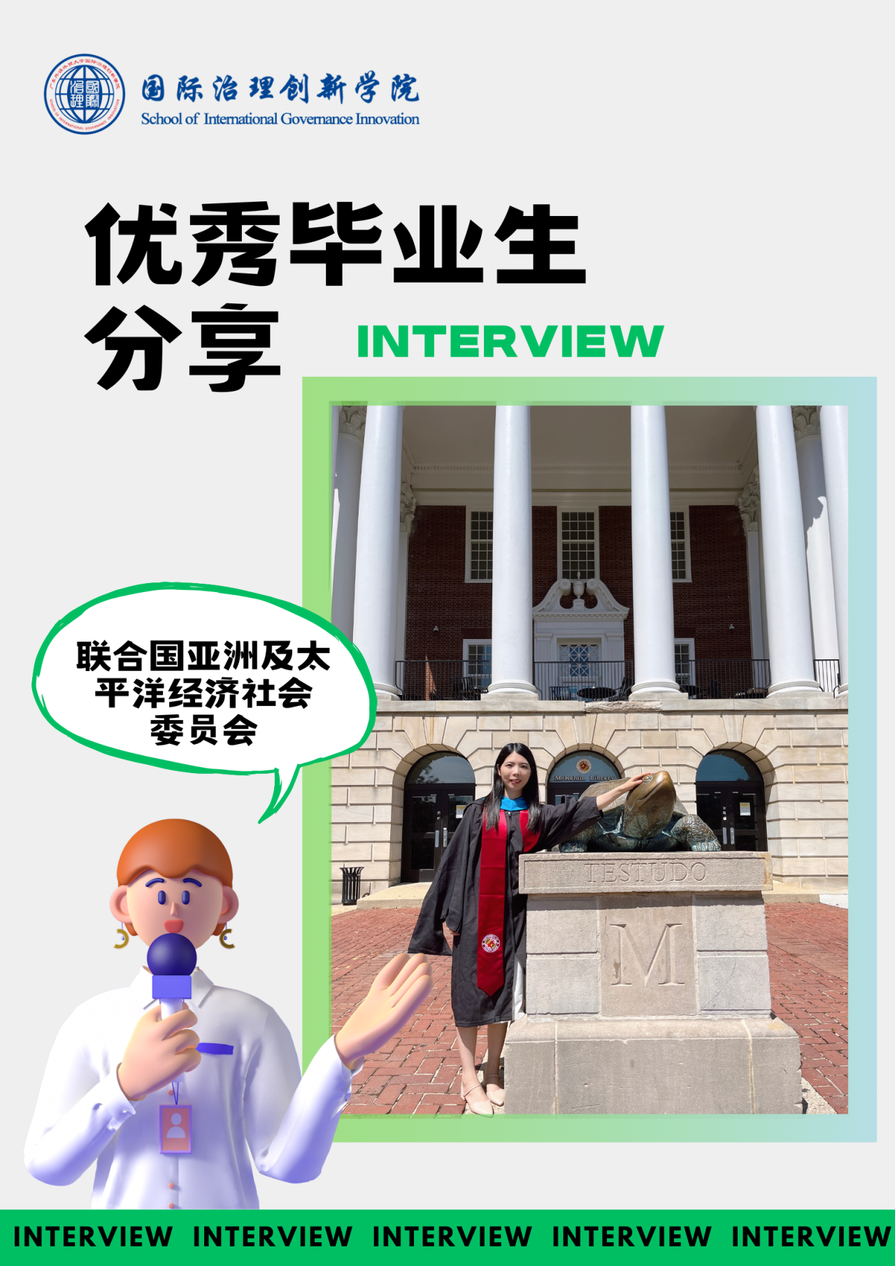 郭青霞,国际治理创新学院、高级翻译学院2020级学生,2022年获得国家留基委支持,公派赴美国马里兰大学继续深造,2023年获得广东外语外贸大学翻译学硕士学位,同年8月获美国马里兰大学公共管理硕士学位,现于联合国亚洲及太平洋经济社会委员会(U.N. Economic and Social Commission for Asia and the Pacific, ESCAP)下属的亚太信息通信技术促进发展培训中心(Asian and Pacific Training Center for Information and Communication Technology for Development, APCICT)实习工作。