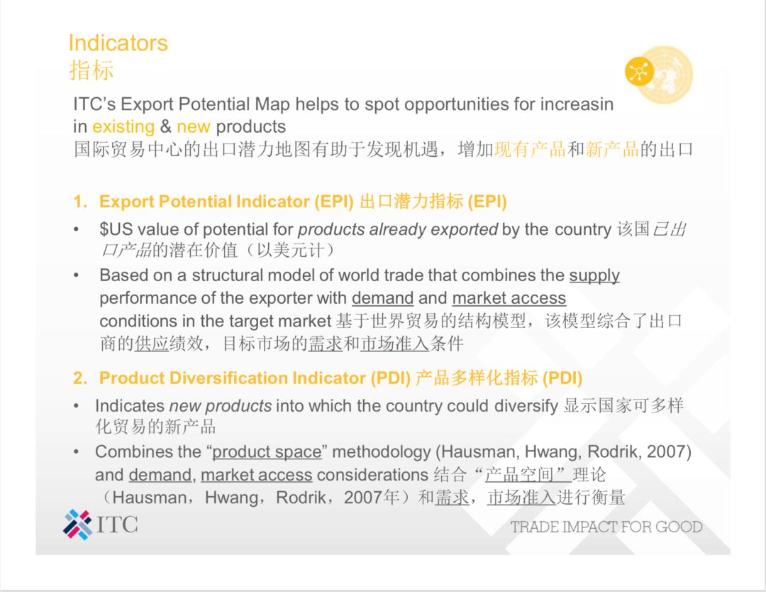 联合国国际贸易中心的出口潜力数据图地图包含两个指标——出口潜力指标(EPI)和产品多样化指标(PDI)。