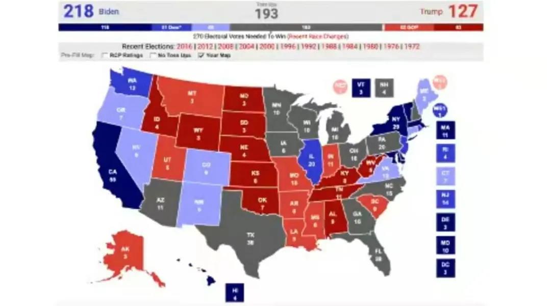 上图中,红色代表确定支持特朗普的州,粉红色代表倾向支持特朗普的州,深蓝色代表确定支持拜登的州,浅蓝色代表倾向支持拜登的州,灰色代表不确定的州(通常称之为“摇摆州”)。通过这张统计图,我们发现拜登至少有218张确定的选票,而特朗普有217张确定的选票。在此期间,只有摇摆州支持特朗普,特朗普才有可能会超过拜登。