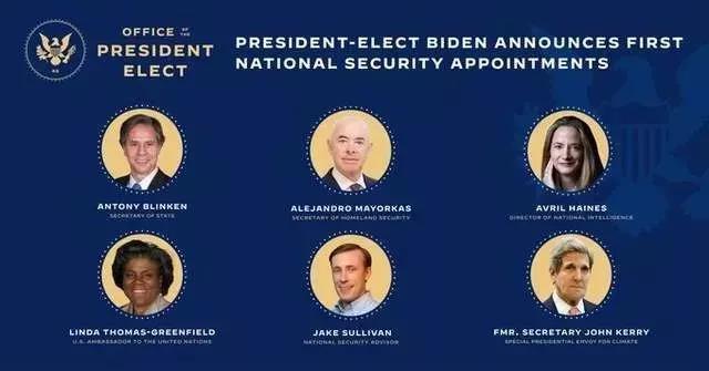 在这次提名宣布之前,拜登已经宣布选定安东尼·布林肯(Antony Blinken)担任国务卿一职。这六个领导人里面有四个需要参议院投票确认,杰克·沙利文(Jake Sullivan)和约翰·克里(John Kerry)不需要确认投票。