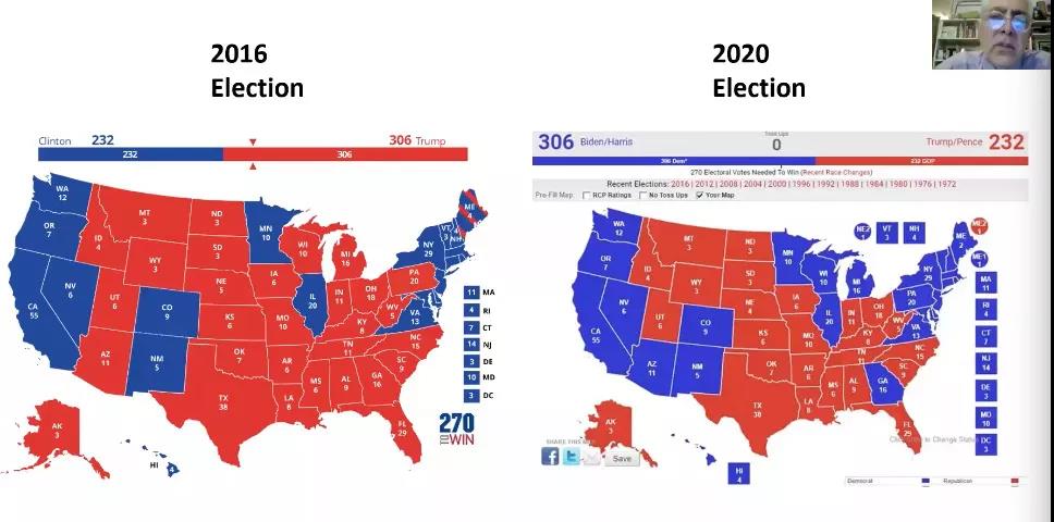在本期的研讨会中,Mark教授首先回顾了第三期研讨会中已介绍过美国的选举史和选举人票制度,接着将2016年和2020年美国大选选票情况进行对比,深入分析2020年美国大选选票的变化及原因,并对美国总统的赦免权力和现任总统拜登的内阁成员进行介绍。