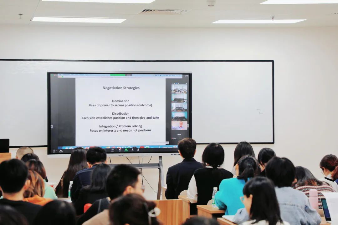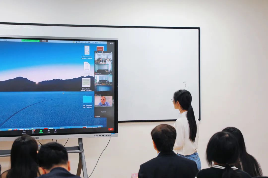 模拟谈判活动结束后,Larry Crump教授随机邀请了部分学生讲解模拟谈判的练习过程,学生们隔着屏幕与教授一起回顾谈判过程,分享谈判体验,也说出了过程中遇到的问题和困惑,也听取了教授的建议和指导。