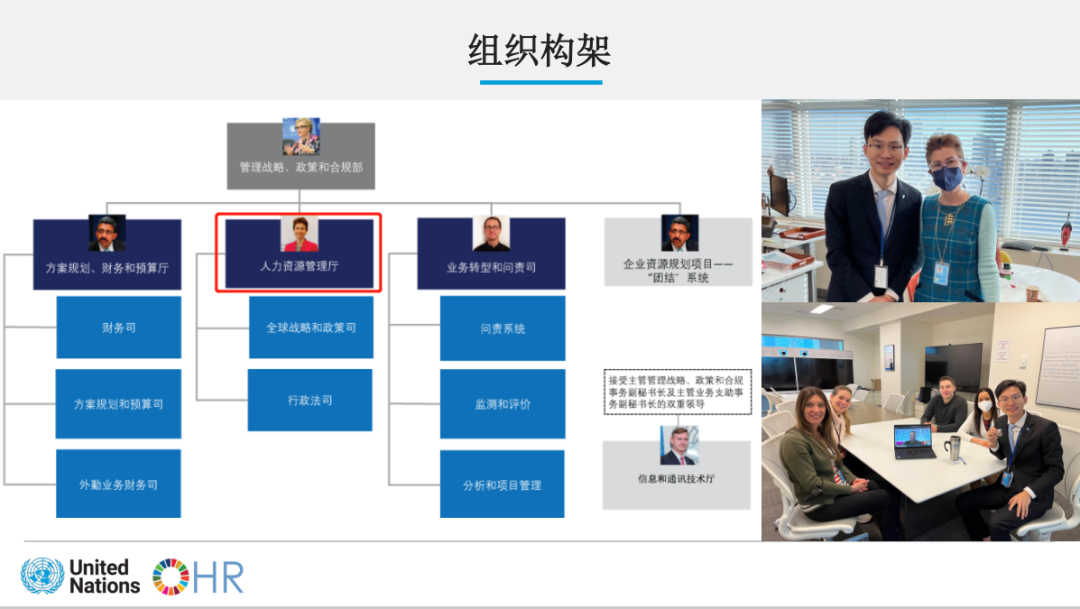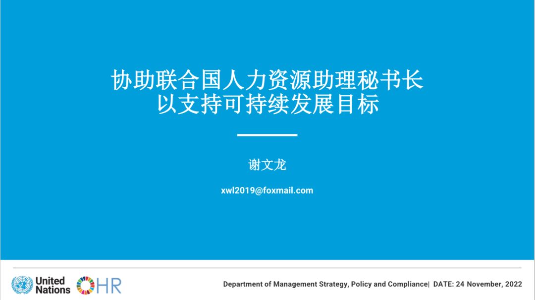 运营网站HR Portal是谢文龙的日常工作之一,该网站涵盖了员工薪酬福利、健康福利、学习项目等内容。除网站运营外,谢文龙还负责联合国系统人事管理、数据统计、通讯传播及协助举办国际活动等工作。
