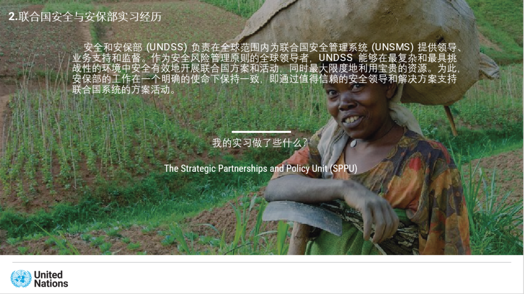 此外,向筱含实习所在的战略规划和政策部门主要是负责各种安全政策的研究和制定,而她主要在人道主义行动安全会议中负责记录行动要点。作为记录员,向筱含在工作过程中真切感受到了大家对维和与安保工作的热情与执着,所有人都在尽自己所能保护每一个生命,以智慧和勇敢捍卫着正义和光明。在日常工作中,她还负责不同机构间的联络和网络资料的搜集整理,必须保证信息的准确性和真实性,反复审核与校对每一个细节,这些都要求她严谨对待每一项工作。