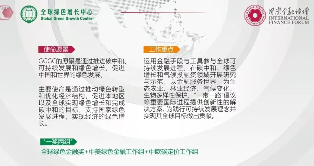 其中,全球绿色增长中心的常设机制之一绿色金融工作组,主要负责推动G20可持续金融工作组目标的“二轨”对话机制。