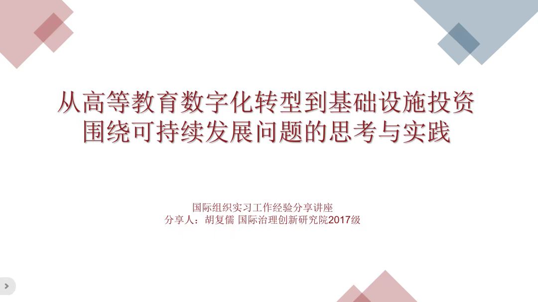 2022年12月3日上午,由国际治理创新研究院举办的“国际组织实习工作经验分享系列讲座”第四讲于线上召开。2017级学子胡复儒以“从高等教育数字化转型到基础设施投资,围绕可持续发展问题的思考与实践”为题,介绍其在联合国教科文组织实习以及在亚洲基础设施投资银行的工作情况。国际治理创新研究院院长赵龙跃教授主持讲座,研究院全体学生以及部分外校学生参加讲座。