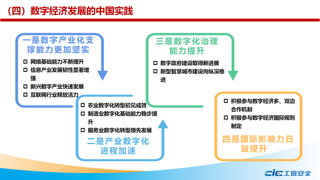 从全球格局态势来看,数字经济正在形成以美、中、欧为主导的“三极”竞争格局。根据中国信通院2021年的最新数据,美国数字经济规模位列全球第一,各项数字技术领跑全球;中国规模排名第二,在数字市场方面拥有绝对优势;欧盟排名第三,其数字经济规则制定处于全球领先地位。黄梁峻强调,数字经济已经成为又一次国与国之间经济利益的再分配,同时更是我国抢抓新一轮科技革命与产业变革的新机遇,构筑国家竞争新优势的战略重点。