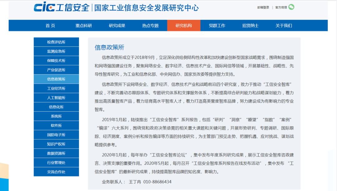 黄梁峻首先为大家简单介绍了国家工业和信息化部各个下属单位的职能,着重介绍了他现在所在的国家工业信息安全发展研究中心。该中心核心业务主要分为三个板块,包括网络安全、信息技术产业和数字化转型。黄梁峻目前所在具体部门是信息政策所,其主要职能是承接上述三个业务板块的数据和信息,进行深度研究,形成体系化的研究成果,为国家决策提供智慧支撑。具体工作包括:撰写专报和智库报告、承接部委和地方政府研究课题以及拓展与企业合作项目。