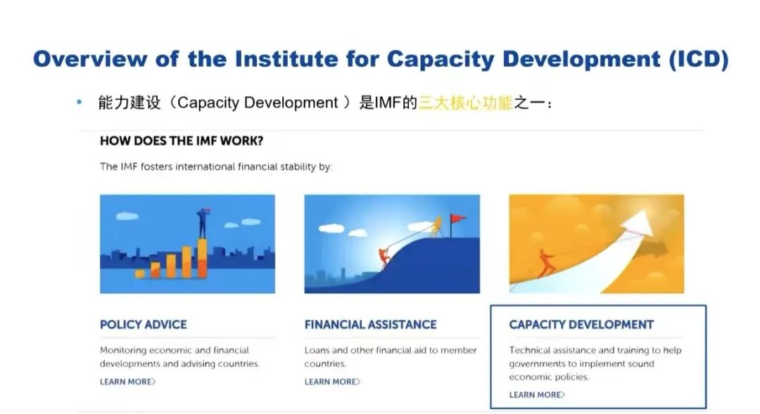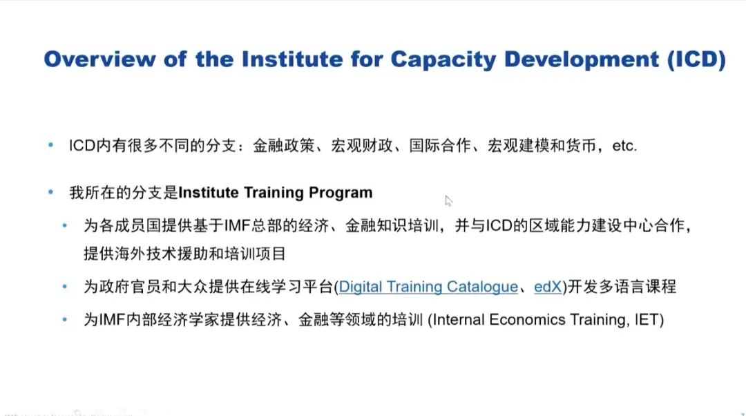 会议伊始,华定简要介绍了国际货币基金组织的背景、功能以及重要使命。国际货币基金组织具有三大核心功能:监督工作、资金援助和能力建设。华定所在的能力建设研究院(The Institute for Capacity Development)主要负责推动“能力建设”工作的开展,尝试通过提供技术援助、培训项目等方式帮助成员国建立有效的经济结构,提高经济稳定性,促进经济增长及实现可持续发展目标。具体的工作开展方式包括在华盛顿总部以及分设在不同国家的全球区域能力建设中心为各国政府提供技术援助和培训、开发在线课程(例如Digital Training Catalogue、edX)等。华定强烈建议有兴趣的同学们注册并学习面向公众开放的网络在线教学课程——edX,做到主动学习,不断实现自我更新。