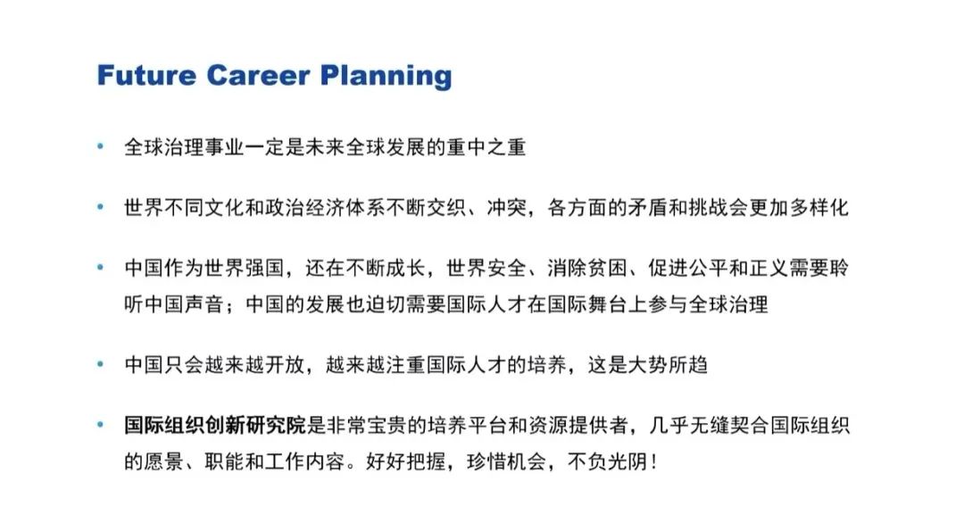 最后,华定围绕“尽早思考”与“持续学习”两个方面与同学们分享他在申请国际组织实习和工作中的经验。在“尽早思考”方面,华定建议同学们要尽早确认自己的兴趣和未来的职业发展方向,尽早申请实习岗位,尽早布局具体的职业发展规划,算好时间节点,预留充足的时间。在职业规划中,还要考虑未来如何寻找和对接国内的资源以及如何更好地利用自己的知识、技能和经验服务祖国,努力为自己的未来绘制一份清晰的蓝图。在“持续学习”方面,华定认为在申请实习以及工作岗位的过程中要不断加强自己的核心竞争力。国际治理创新研究院“五位一体”的培养模式毫无疑问为同学们增添了一大亮点。除此之外,专业技能的培养也十分重要,掌握基本的计量软件和编程软件并将其项目化、具象化地呈现出来,能够极大提高自己的职业竞争力。